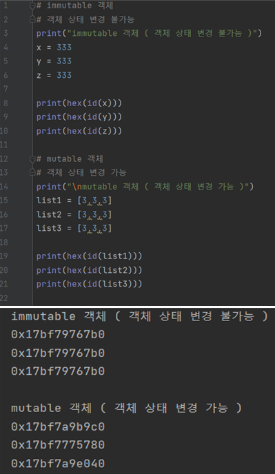 - mutable : 변경되는 객체 ( 객체 상태 변경 가능 ), ex) list, set, dictionary 등