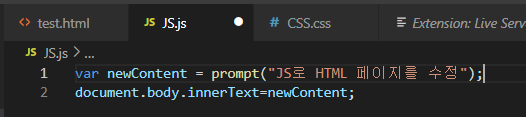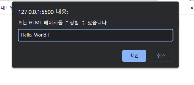- JS는 구조와 스타일에 변화를 주거나 로직을 추가한다고 했다. 이 부분에서는 프롬프트에 값을 받으면 그것을 출력하는 로직을 추가하겠다.