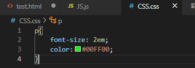 - CSS는 스타일을 담당한다고 말했다. 위에서 태그 p 부분의 폰트 크기와 색상을 바꾼다는 의미이다.