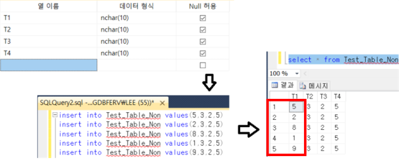 [ 아래 그림, T1으로 비클러스터형 인덱스를 생성한 모습 → 정렬 X ]