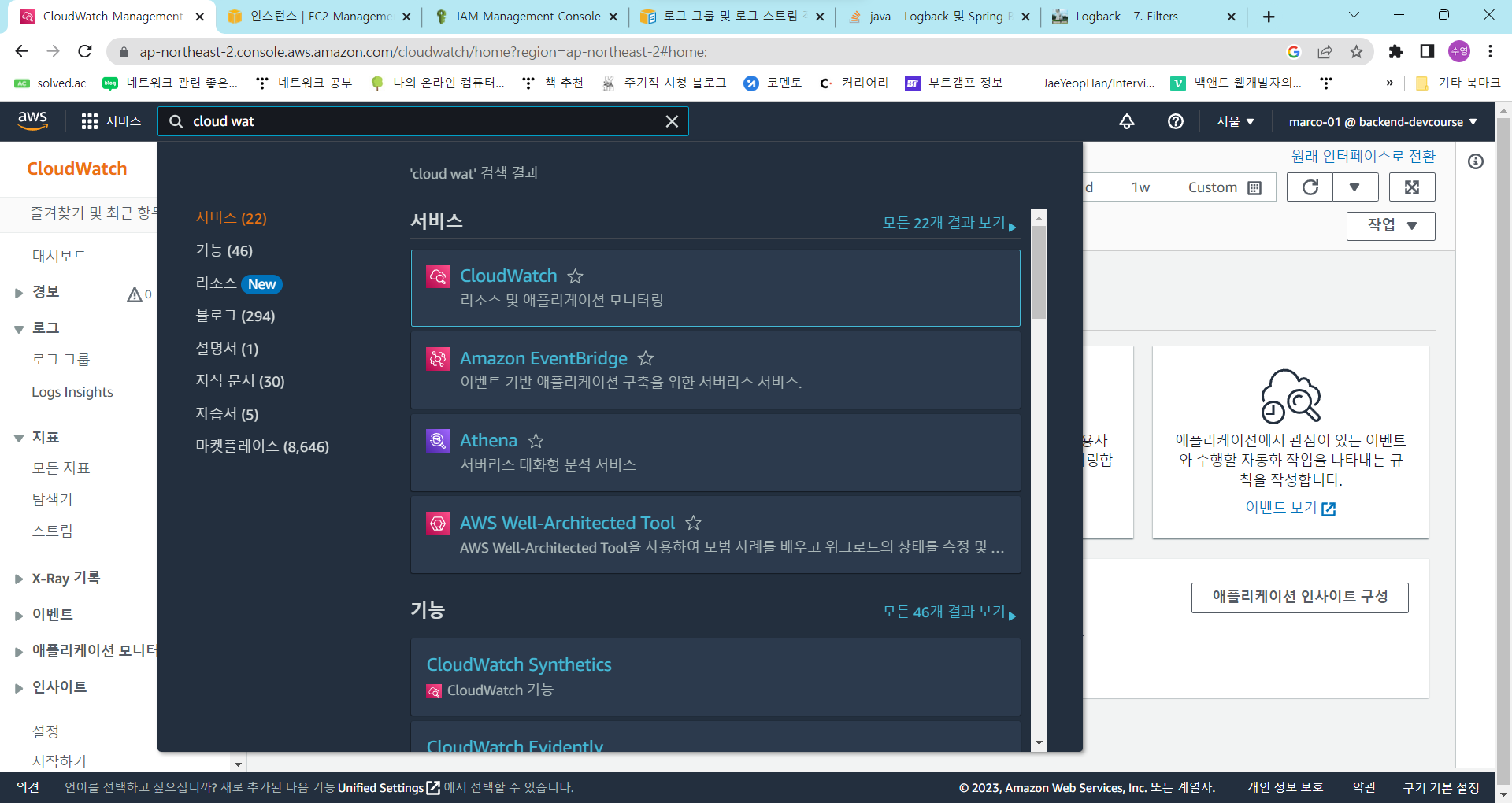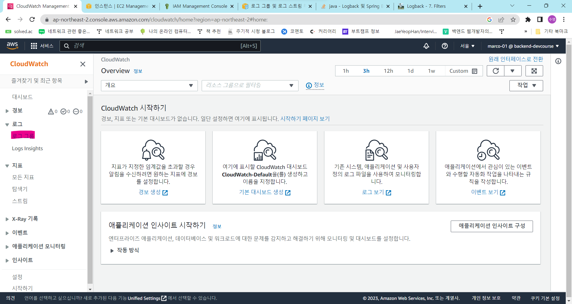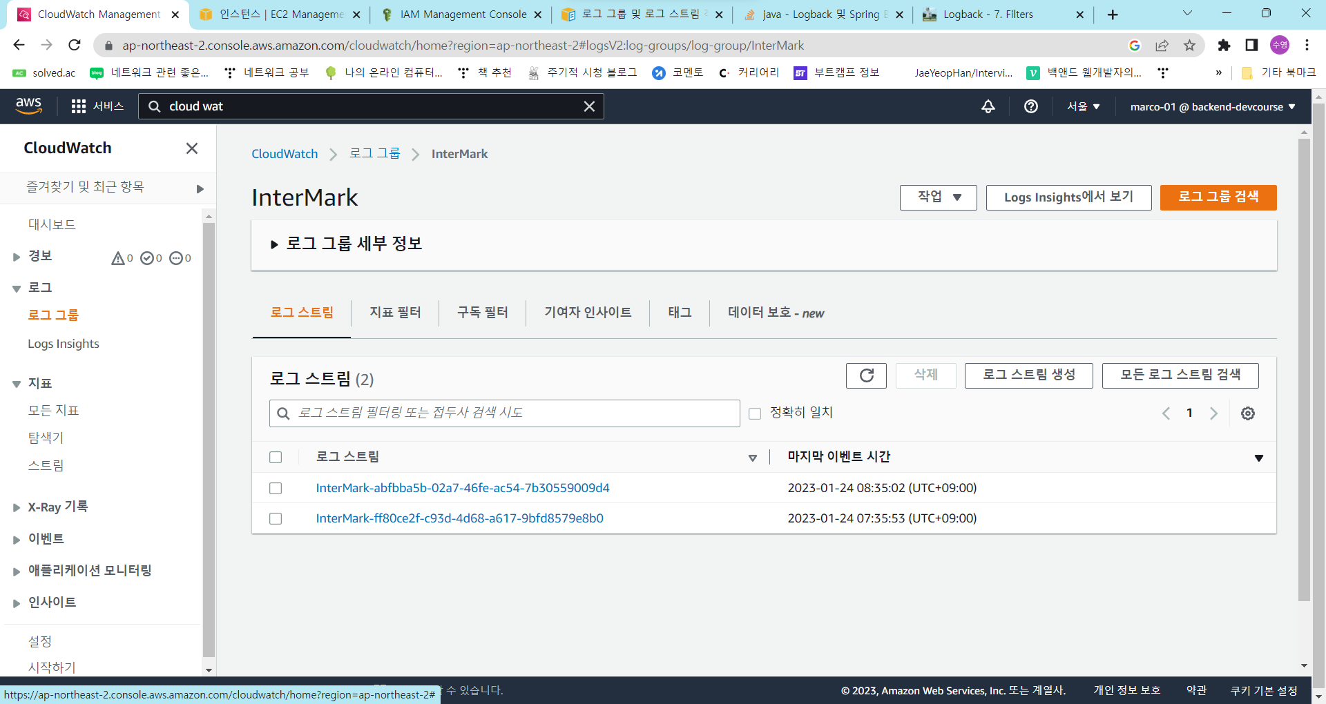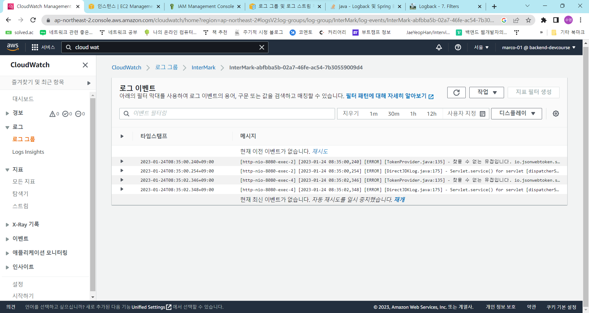 <?xml version="1.0" encoding="UTF-8" ?> <configuration scan="true"> <conversionRule conversionWord="clr" converterClass="org.springframework.boot.logging.logback.ColorConverter" /> <springProperty name="AWS_ACCESS_KEY" source="cloud.aws.credentials.accessKey"/> <springProperty name="AWS_SECRET_KEY" source="cloud.aws.credentials.secretKey"/> <property name="LOG_PATTERN" value="%clr(%d{yyyyMMdd HH:mm:ss.SSS}){magenta} %clr([%thread]){blue} %clr(%-5level){} %clr([%logger{0}:%line]){cyan} : %msg %n"/> <appender name="STDOUT" class="ch.qos.logback.core.ConsoleAppender"> <encoder> <pattern>${LOG_PATTERN}</pattern> </encoder> </appender> <appender name="AWS_LOG" class="ca.pjer.logback.AwsLogsAppender"> <filter class="ch.qos.logback.classic.filter.ThresholdFilter"> <level>INFO</level> </filter> <layout> <pattern>[%thread] [%date] [%level] [%file:%line] - %msg%n</pattern> </layout> <logGroupName>InterMark</logGroupName> <logStreamUuidPrefix>InterMark-</logStreamUuidPrefix> <logRegion>ap-northeast-2</logRegion> <maxBatchLogEvents>50</maxBatchLogEvents> <maxFlushTimeMillis>30000</maxFlushTimeMillis> <maxBlockTimeMillis>5000</maxBlockTimeMillis> <retentionTimeDays>0</retentionTimeDays> <accessKeyId>${AWS_ACCESS_KEY}</accessKeyId> <secretAccessKey>${AWS_SECRET_KEY}</secretAccessKey> </appender> <root level="debug"> <appender-ref ref="STDOUT"/> <appender-ref ref="AWS_LOG"/> </root> </configuration>