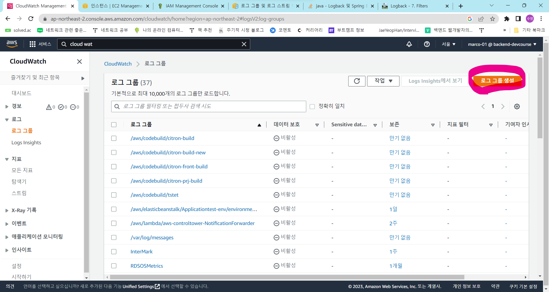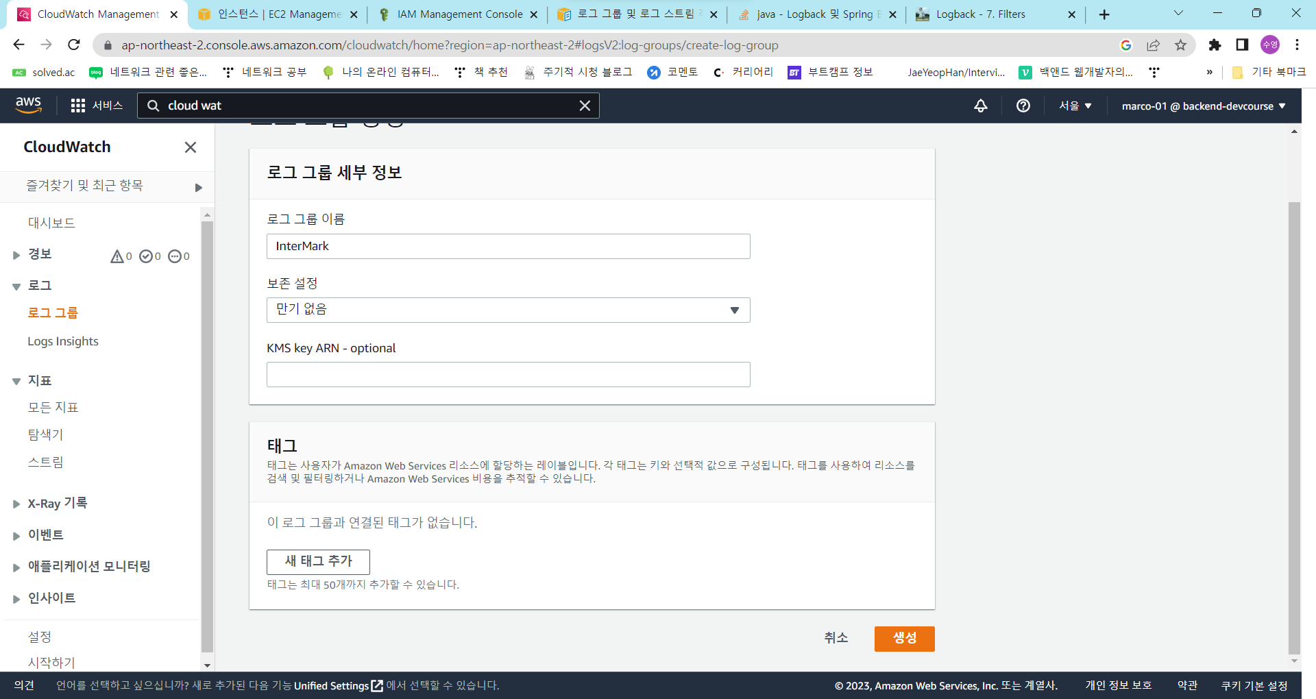 - retentionTimeDays: 로그그룹의 보존기간을 얘기함. 0으로 세팅 시 무기한.