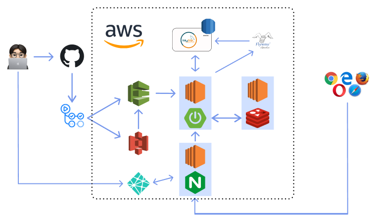 총 4개의 시리즈 글로 진행될 것입니다. 1) Github Actions과 AWS S3 연동 2) EC2 설정과 CodeDeploy 적용 3) EC2와 RDS 4) Nginx 설치와 배포 스크립트 (이번 글) ▶ 전체 흐름도 우선 전반적인 흐름은 다음과 같습