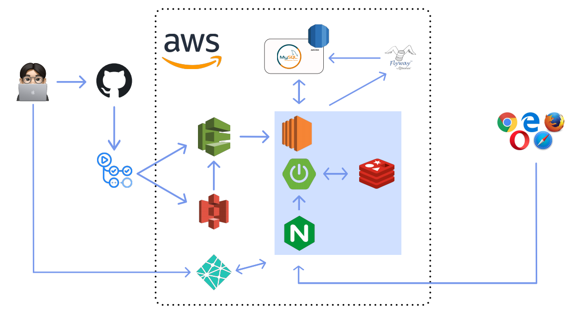 그리고 무중단 배포를 위해서 Nginx가 아닌 CodeDeploy에서 제공하는 Blue/Green 방식의 배포를 이용할 수 있지만 어디서 문제가 발생했는지에 대한 부분을 log로 찍어서 배포가 실패하는 경우도 모니터링을 구성하기 위해 Nginx로 세부적인 무중단 배포의 흐름을 shell 파일로 직접 구성했습니다. 이를 통해서 무중단 배포가 내부적으로 일어나는 과정 또한 이해할 수 있었습니다.