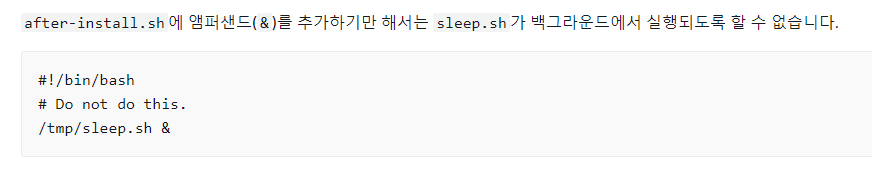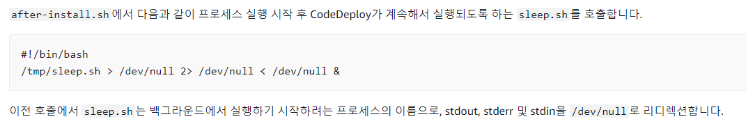 리눅스 기반 OS에서 백그라운드로 프로세스를 실행하려면 &를 붙여야 한다고 알고 있었고 그래서 저도 위와 똑같이 &만을 붙였습니다. 하지만 Code Deploy 사용 설명서에서는 이것만 추가해서는 백그라운드에서 실행되도록 할 수 없다고 합니다.